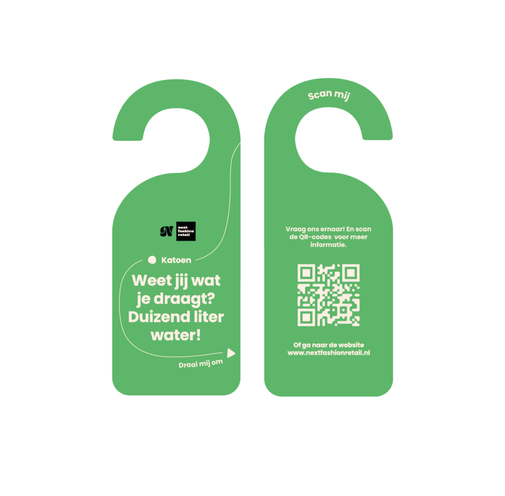 I made a set of hangers in combination with a website. The hangers would be hanged in the clothing racks in between the clothing pieces and have stimulating questions on them with QR-codes. The QR-code will lead you to the website where you can find more information on sustainability.